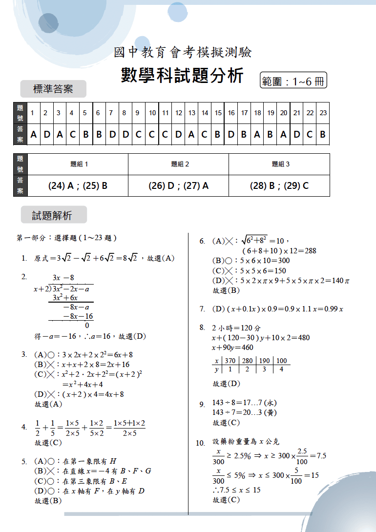 題目不與現有市售資源相同,題量、知識點、難易度仿照會考。
